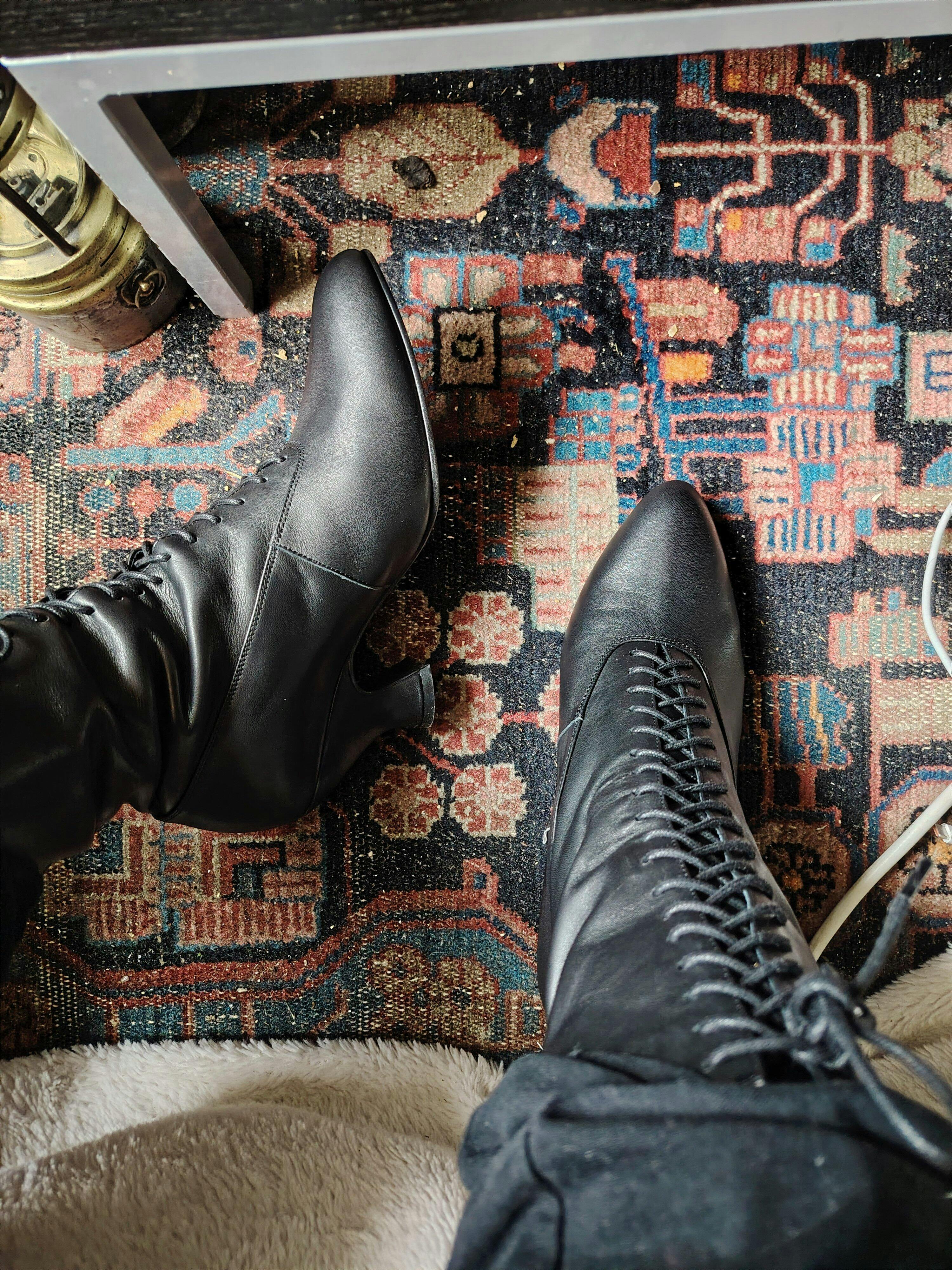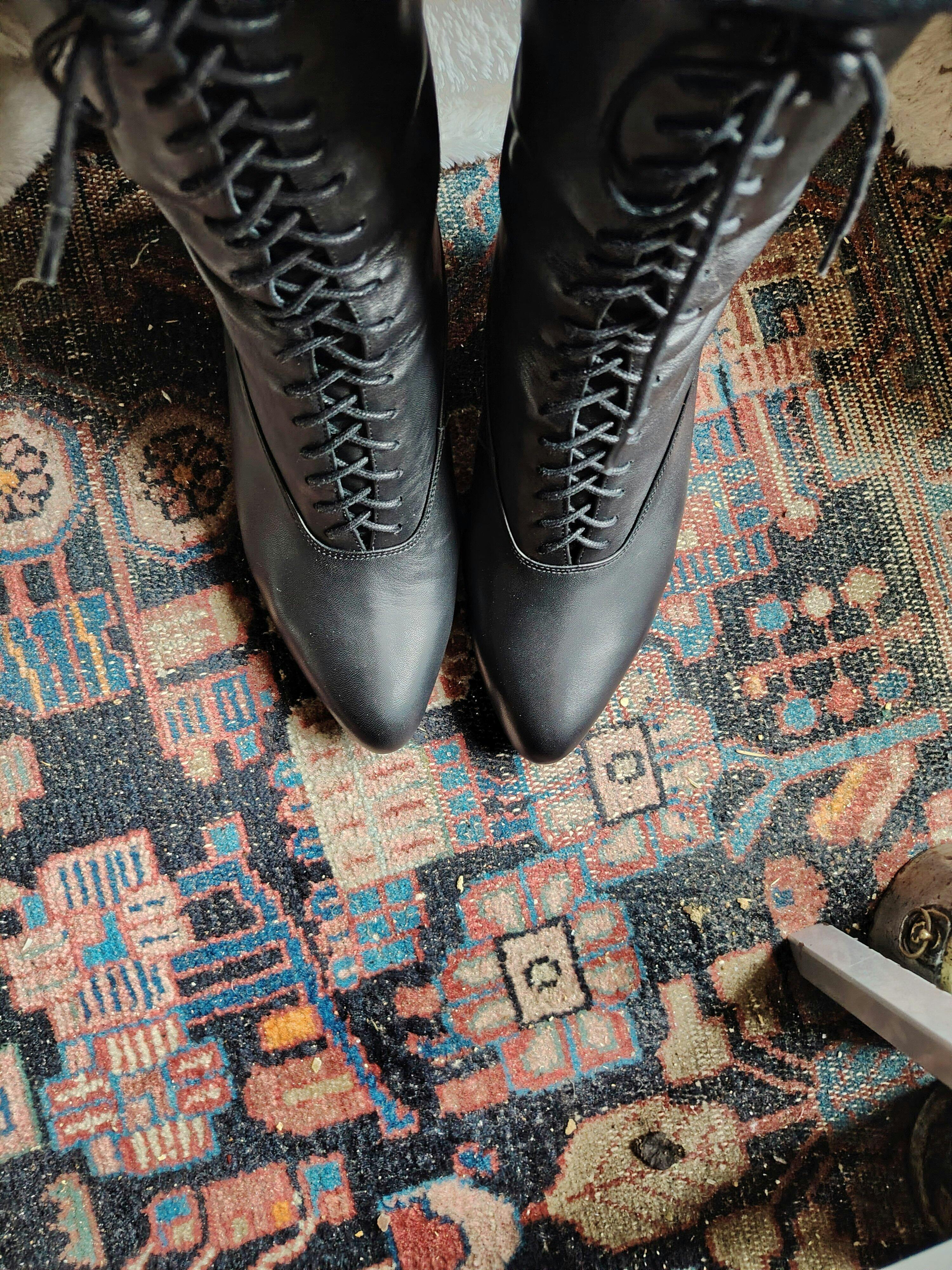 These boots are fabulous! I wore them for the first time a few days after they came (and they arrived so much faster than I thought they would) Once I figured out how much to open the laces to get them on my feet (it took a little practice to figure that out) I am so pleased at how comfortable these boots are! The leather is soft and pliable enough to be comfortable right out of the box, and how very nice they looked with my dress for the event I attended. I also really love the stylishness and stability of the pompadour heel; I'm in my 60's and find the wider heel easier to walk in than a typical high heel.