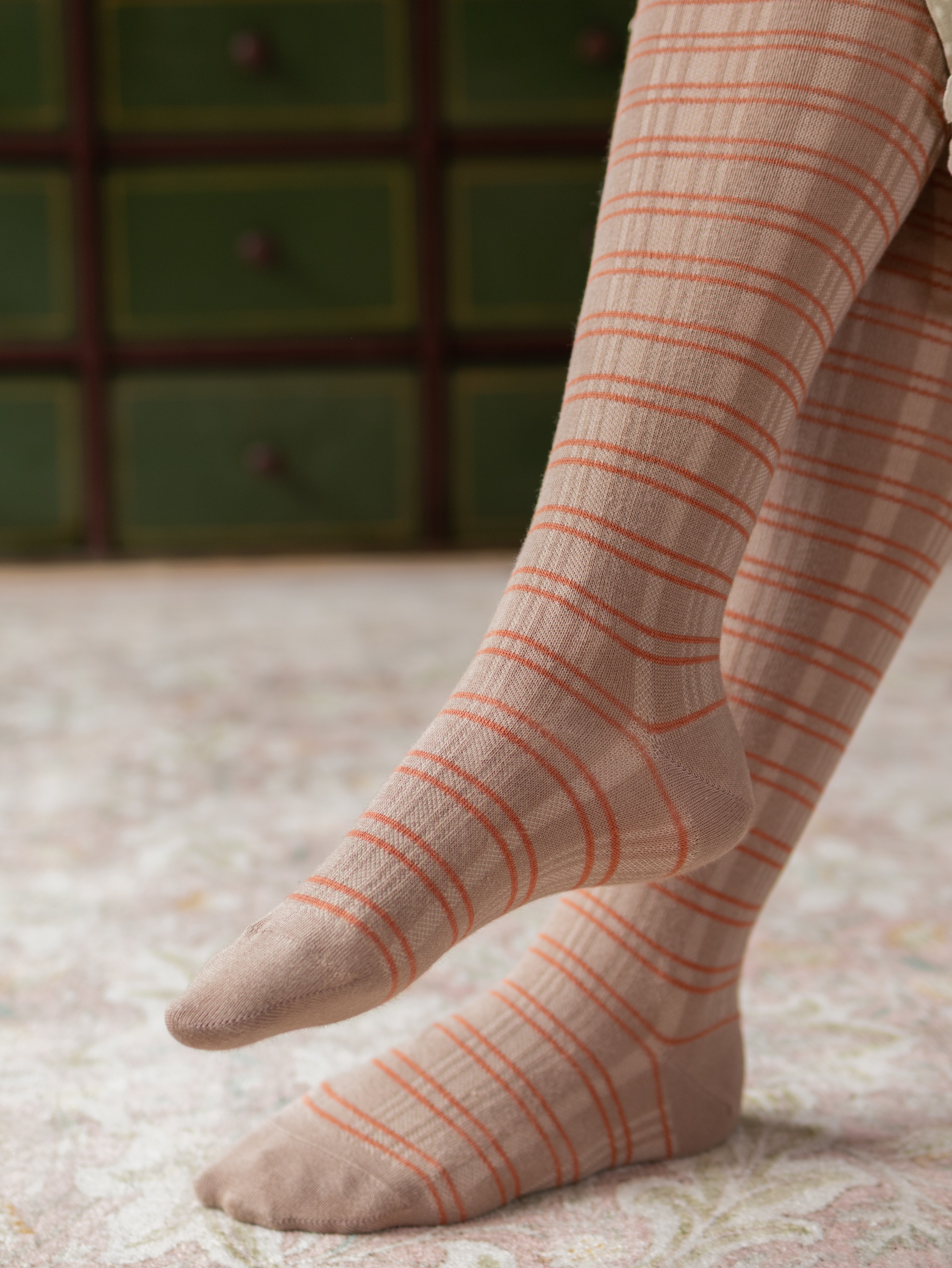 In the 1920s, women wore garter stockings, but today most prefer tights. So we have designed tights with a vintage knit pattern inspired by an original pair of 1920s garter stockings.